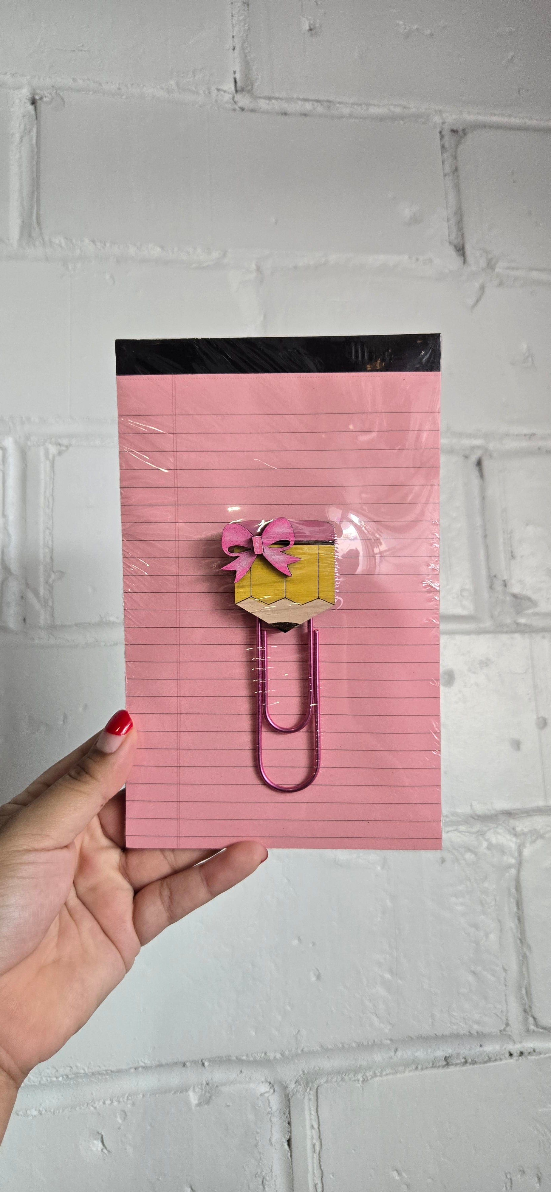 The perfect desk accessory for organizing your thoughts (and doodles)! This pink notepad features an oversize wooden paper clip that adds a touch of whimsy to your work space. Keep your notes neatly clipped and your desk looking cute with this adorable combination of function and fun.